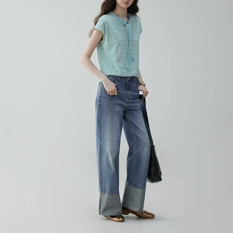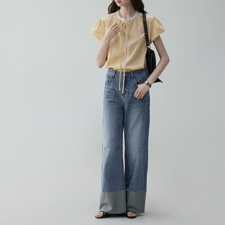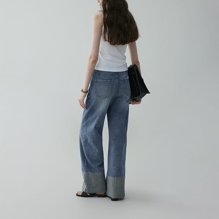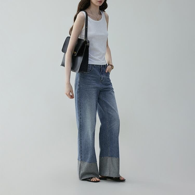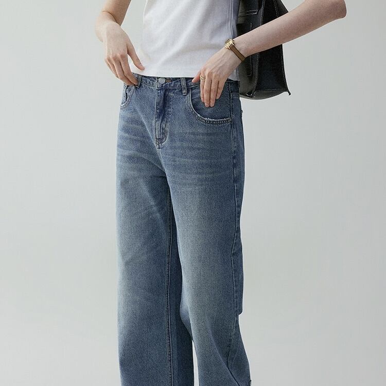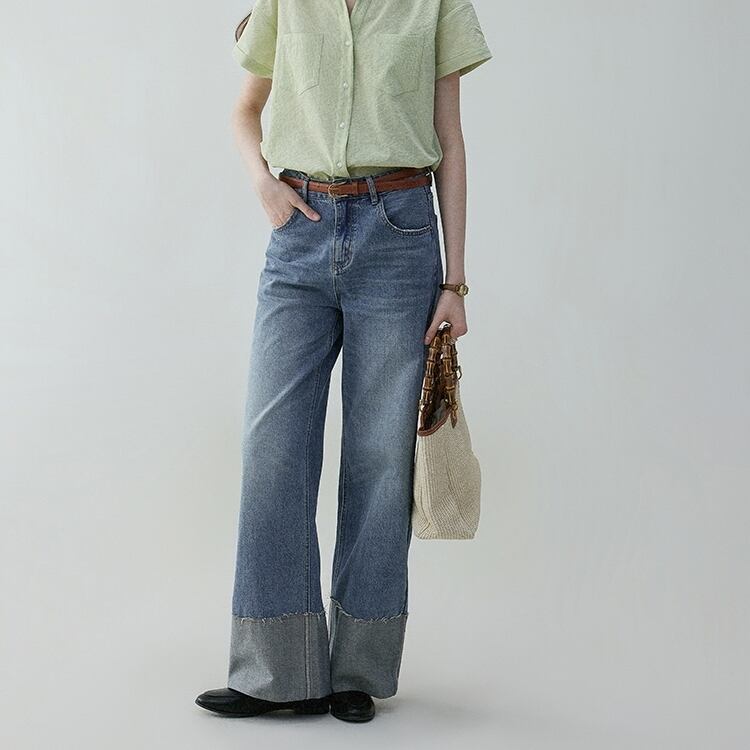 脚のラインを美しく見せるハイウエストデザインとワイドシルエットが魅力のデニムパンツ