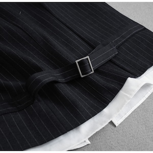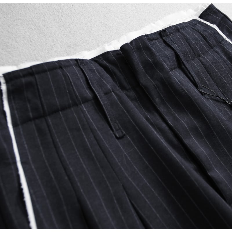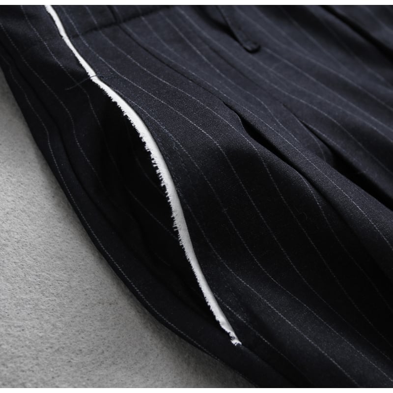 スタイリッシュなストライプ柄のベストとタックの入ったテーラードパンツのセットアップ