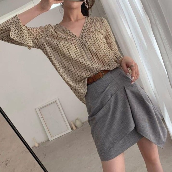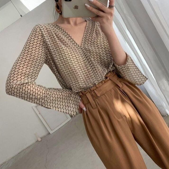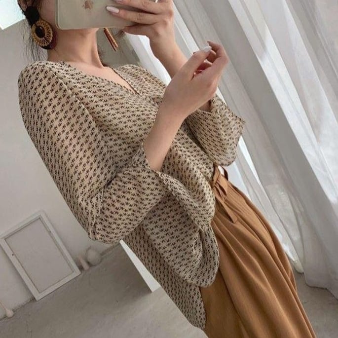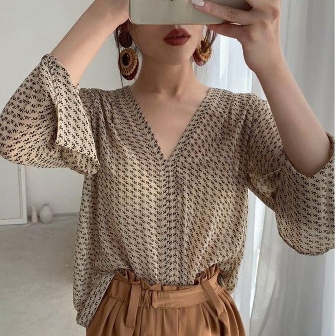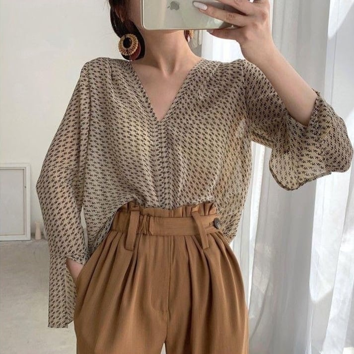 軽やかなシフォン素材のVネックプリントブラウス