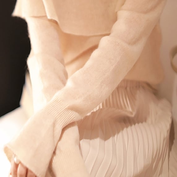 肩のラインが緩やかに落ちるデザインで、リラックスした着心地のニット