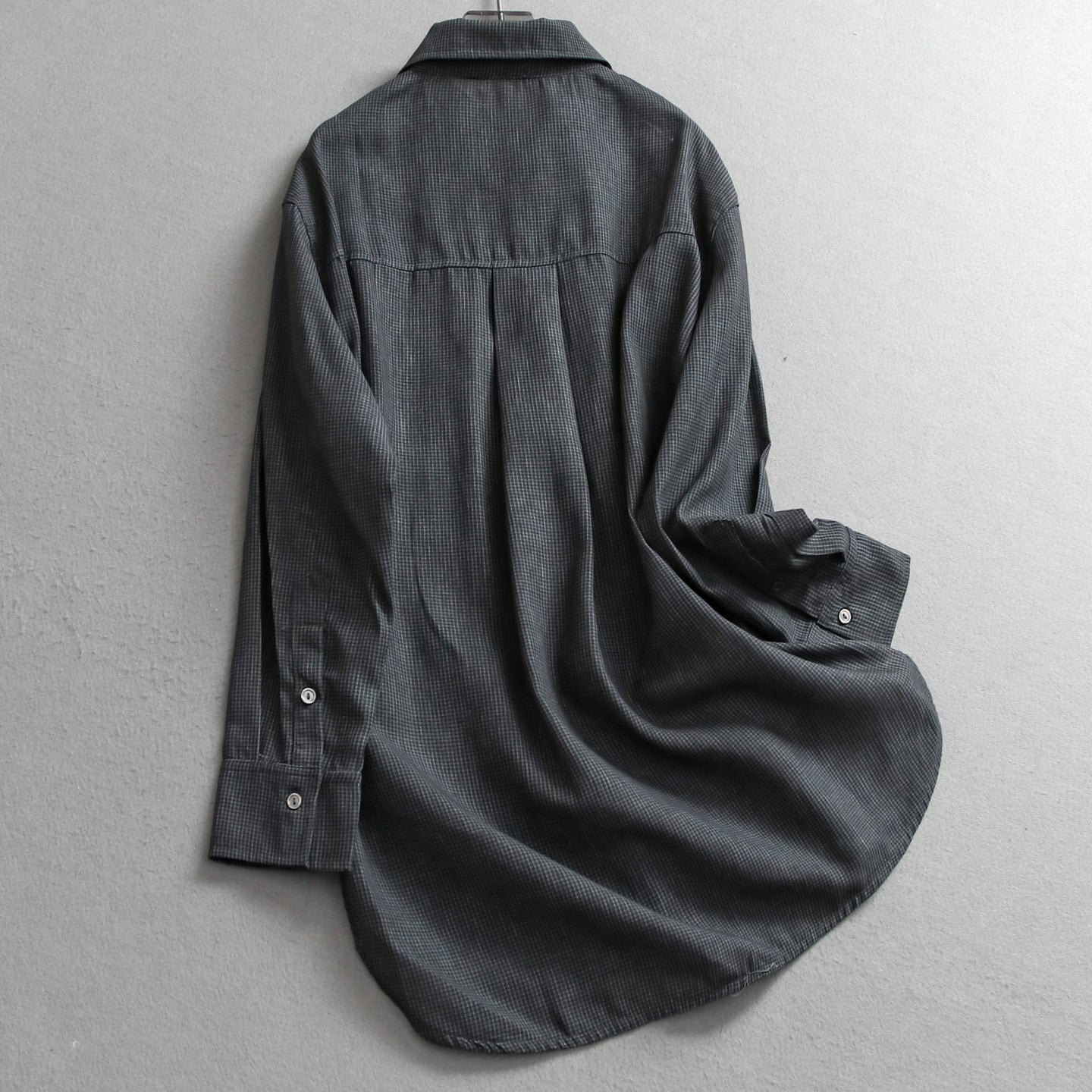 襟付きでヒップが隠れる丈のゆったりシャツ