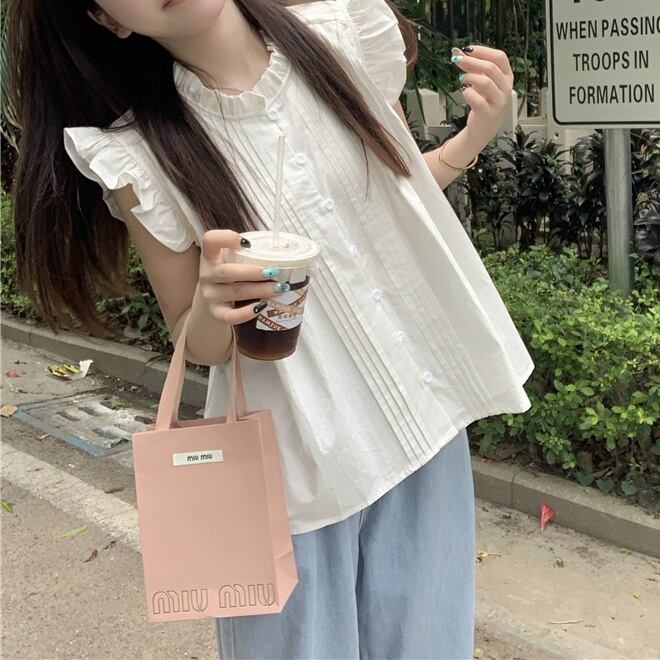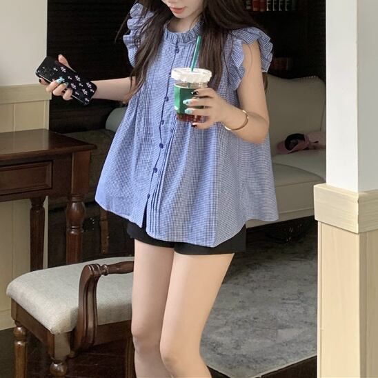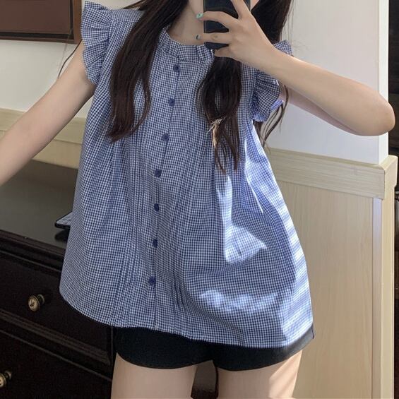 ホワイトとチェックブルーが爽やかなフリル付きスリーブレスシャツ