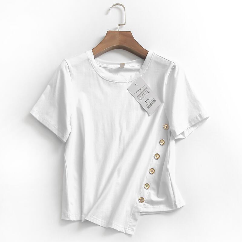 ボタンがアクセントとなった、アシンメトリーなデザインが特徴のTシャツ