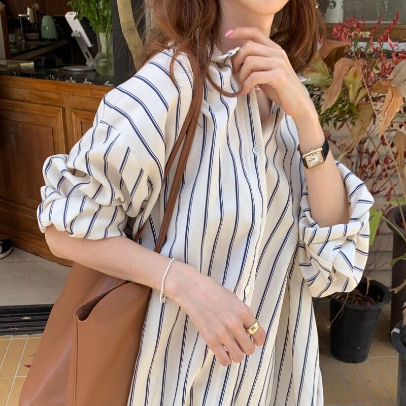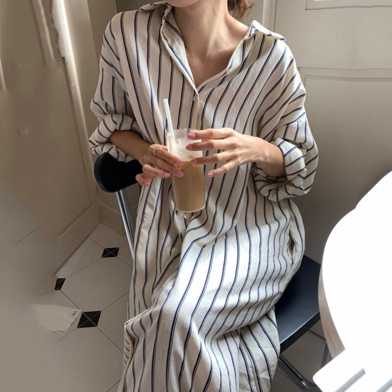 長めの丈とのゆったりとしたシルエットのストライプシャツワンピース
