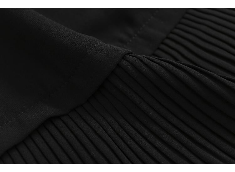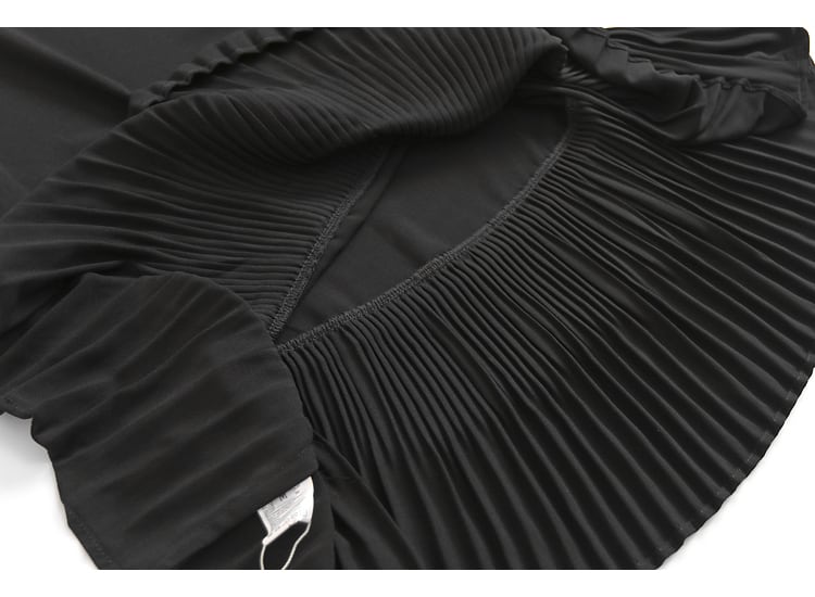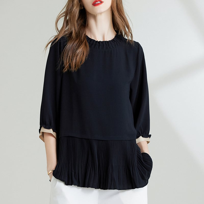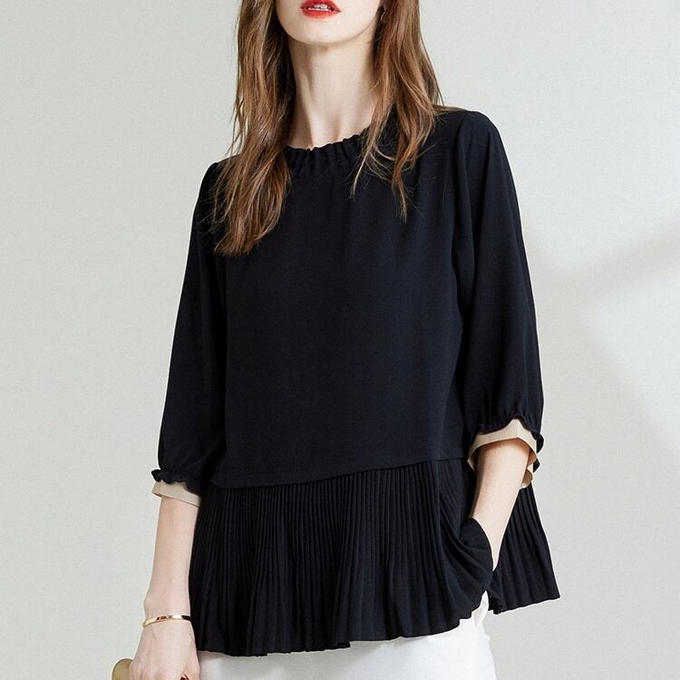 裾のプリーツデザインが上品なアクセントになっている7分袖チュニックブラウス
