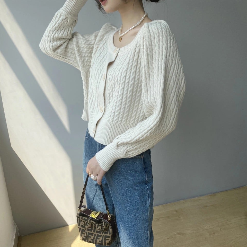 ふんわりとした袖が可愛いショート丈のニットカーディガン