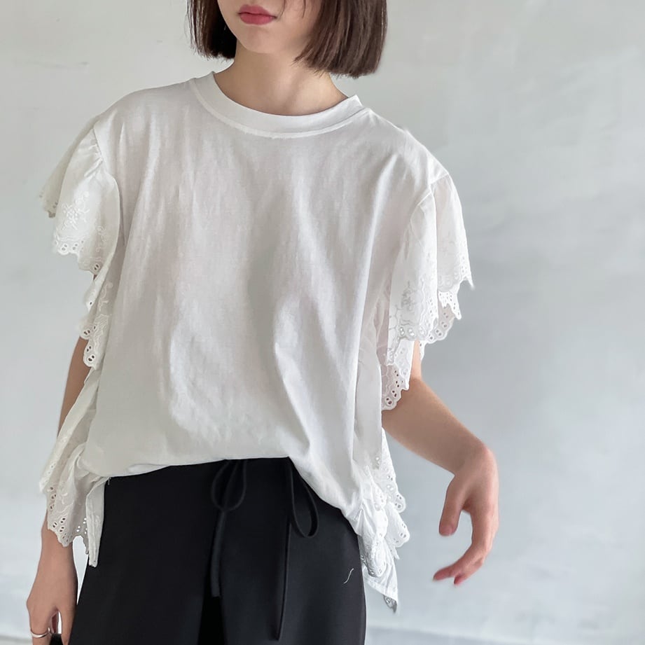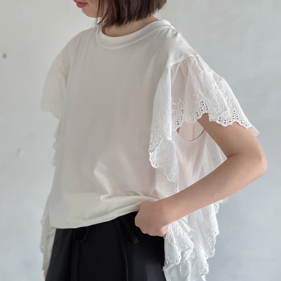 肩から脇へと続くレースフリルがかわいいTシャツ