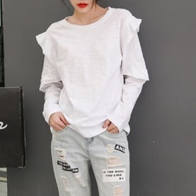 シンプルながらも華やかさを感じさせるフリルデザインのロングスリーブトップス