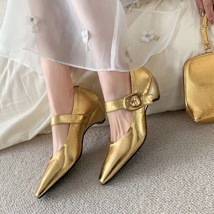 洗練されたゴールドバックルがアクセントのポインテッドパンプス