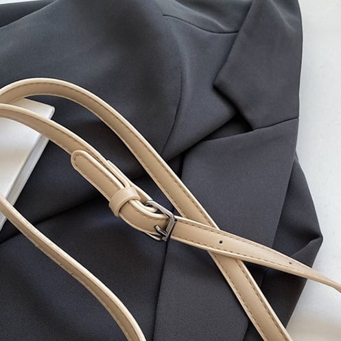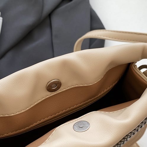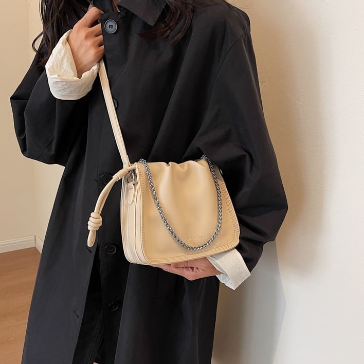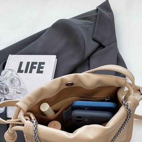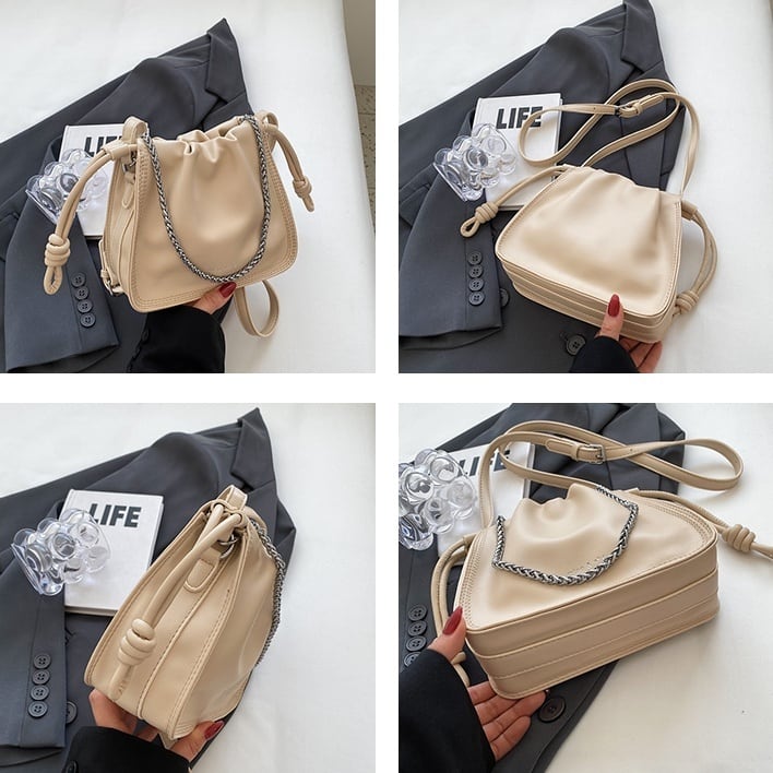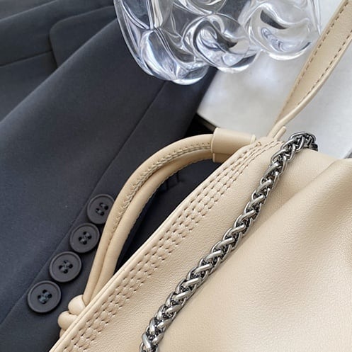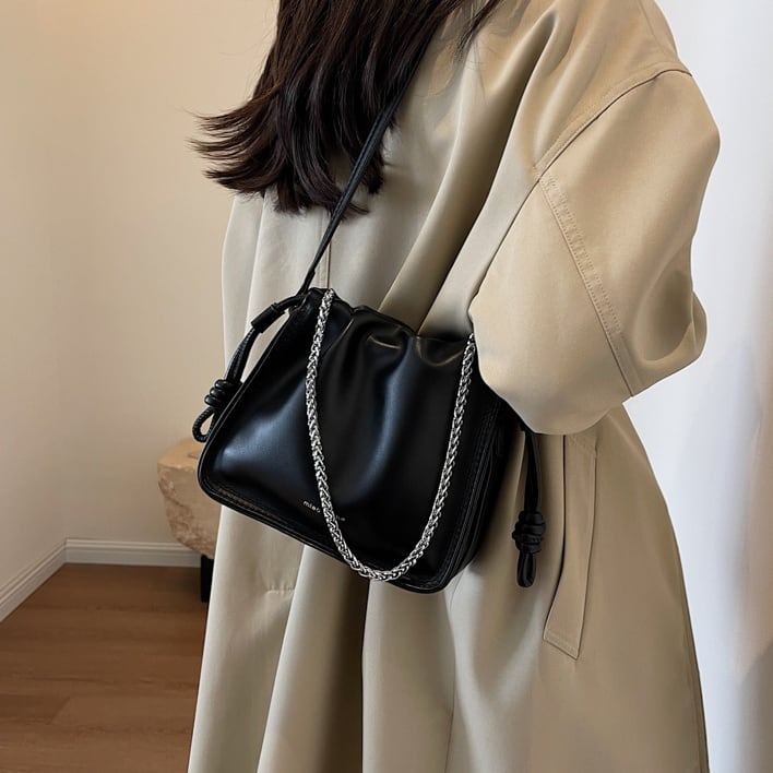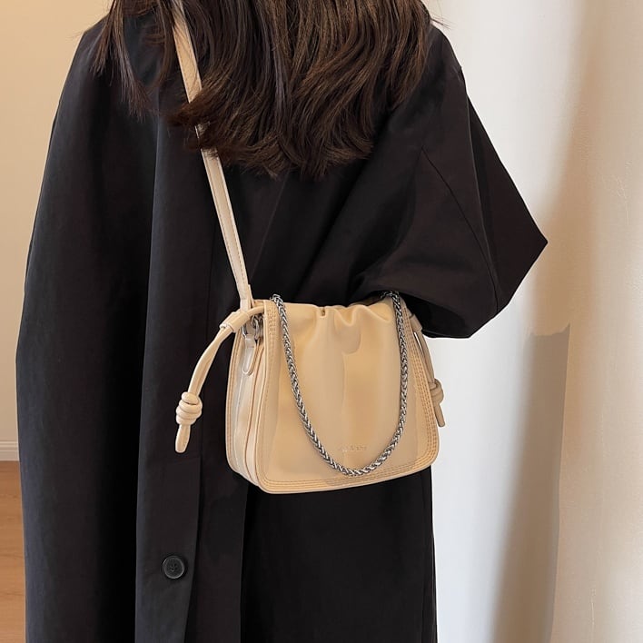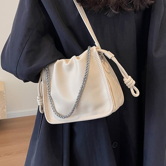 ドローストリングとチェーンストラップが絶妙なバランスで融合したショルダーバッグ